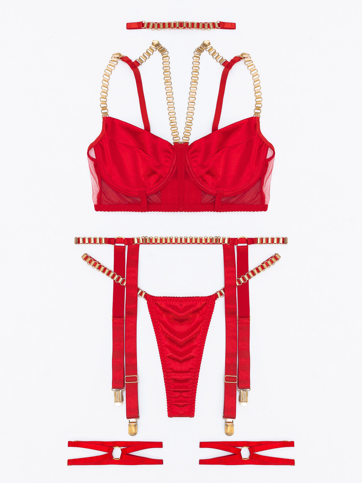 - Το σετ εσωρούχων αποτελείται από 5 τεμάχια μαζί (5 pieces set) – το μπούστο, το choker, το string, τη ζαρτιέρα και τις καλτσοδέτες – μαζί
