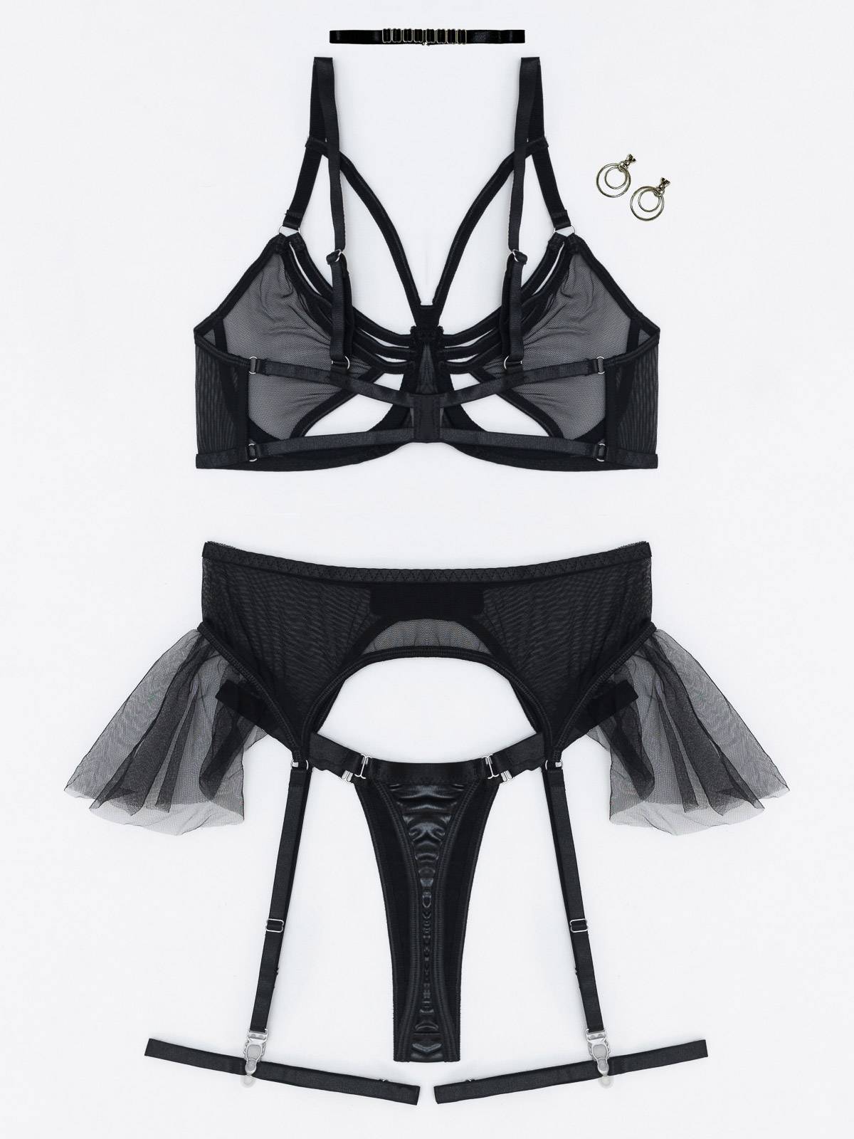 - Αισθησιακό σετ εσωρούχων αποτελείται από 5 pieces -μαζί- το σουτιέν διαφάνεια, το ψηλόμεσο String από δερματίνη, το choker, τα γάντια, τη ζαρτιέρα και τις καλτσοδέτες (5 pieces set)