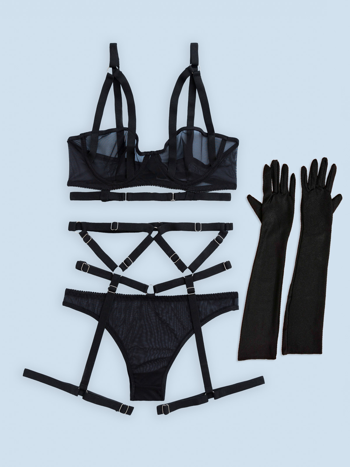 - Το σετ εσωρούχων αποτελείται από –4- τεμάχια: το σουτιέν, το brazil, τα μακριά γάντια και ζαρτιέρες με τις καλτσοδέτες -μαζί- (4 pieces set)