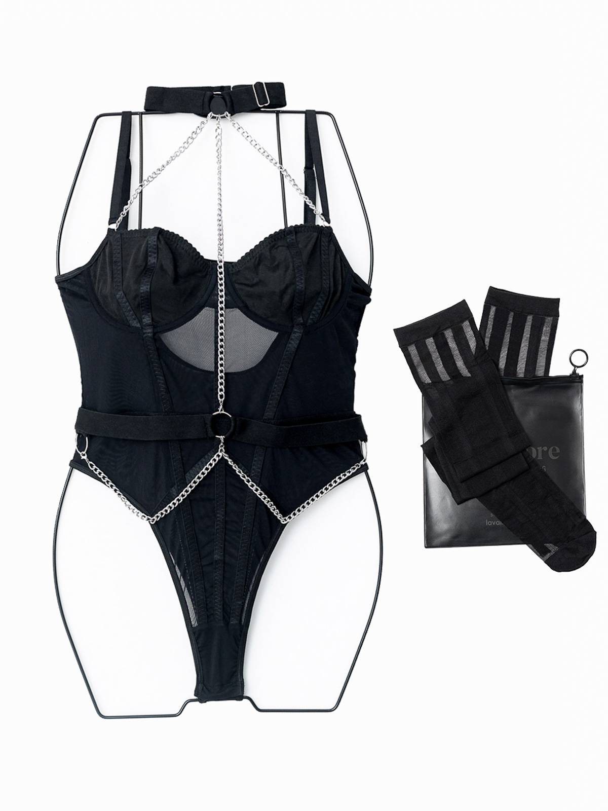 - Το Body String αποτελείται από 4 τεμάχια -μαζί- το body string, το choker με τη ζώνη και τις ψηλές κάλτσες (4 pieces set)