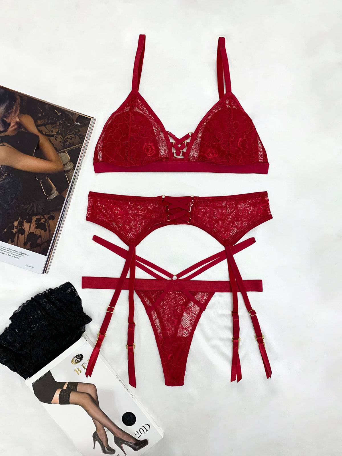 Bralette Set με String Δαντέλα και Κάλτσες