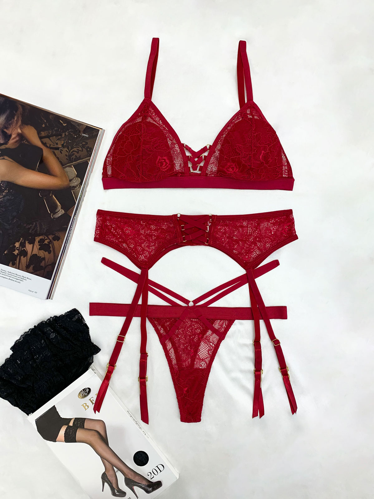 Το σετ περιλαμβάνει -4- τεμάχια: το Bralette με το εσώρουχο String, τις ζαρτιέρες και τις κάλτσες με σιλικόνη –μαζί– σε προνομιακή τιμή απόκτησης (4 pieces set) + ΔΩΡΕΑΝ Μεταφορικά + Αντικαταβολή