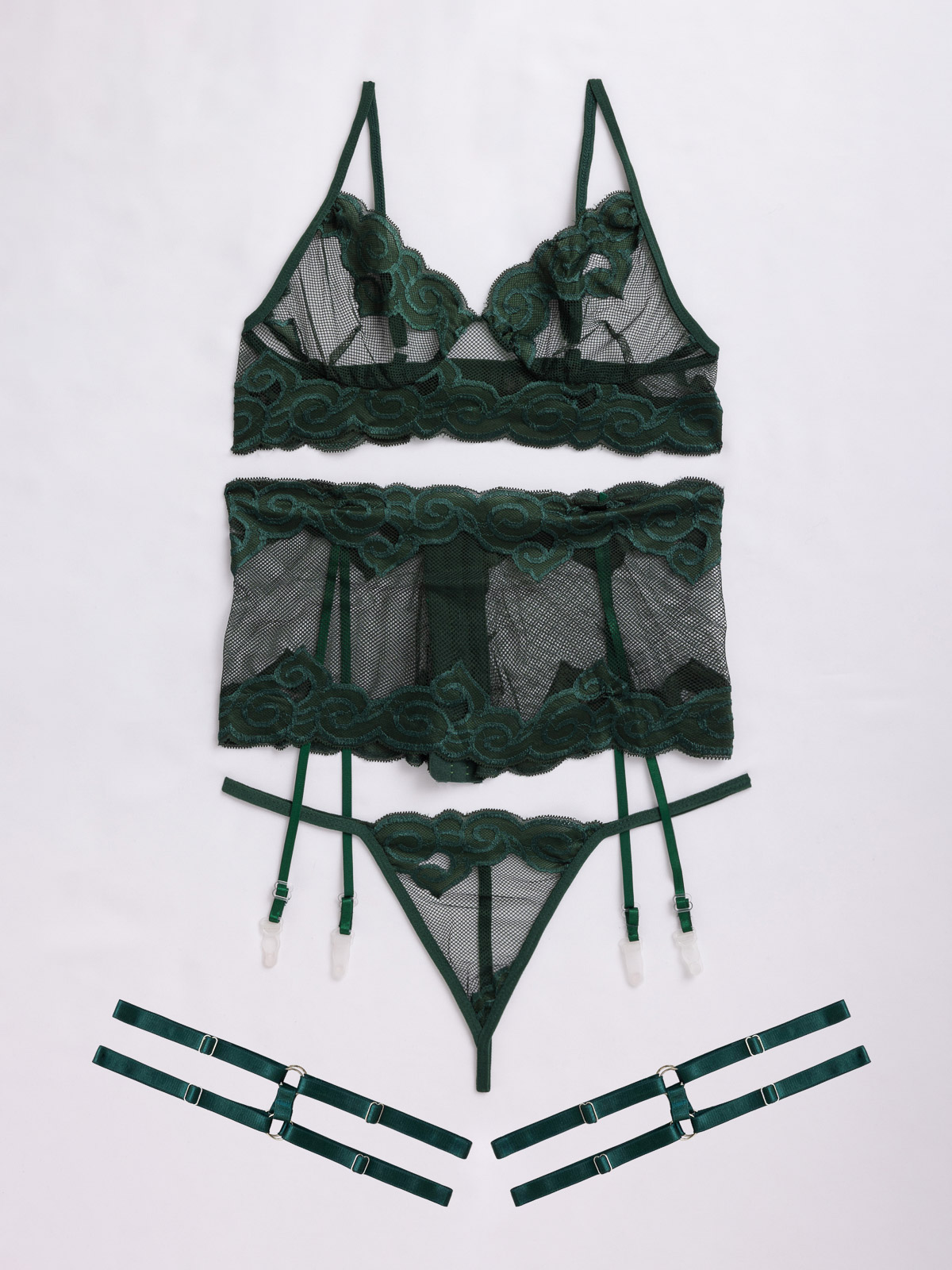 - Το σετ εσωρούχων αποτελείται από -4- τεμάχια, μαζί: το bralette, το string, την ζαρτιέρα και δύο ρυθμιζόμενες καλτσοδέτες (4 pieces set)