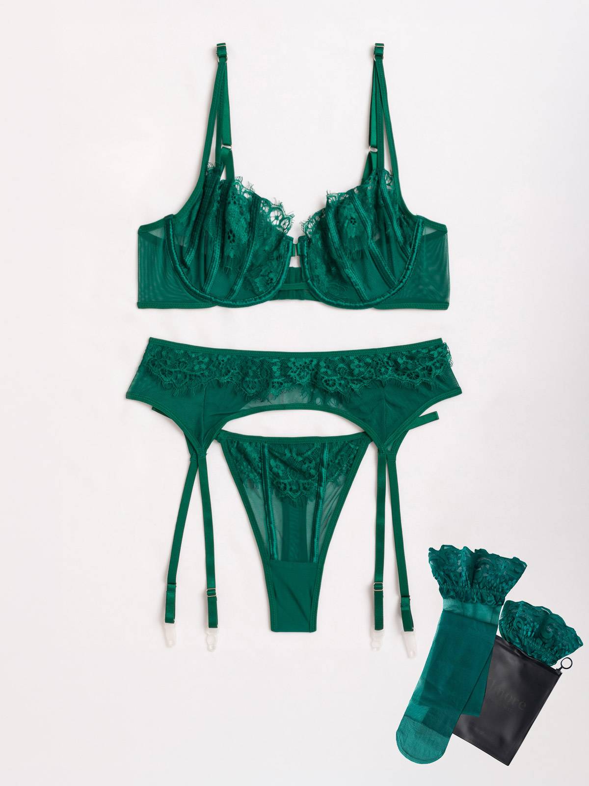 - Το σετ εσωρούχων αποτελείται από -4- τεμάχια: το σουτιέν, το string, τη ζαρτιέρα και τις ψηλές κάλτσες -μαζί- (4 pieces set)