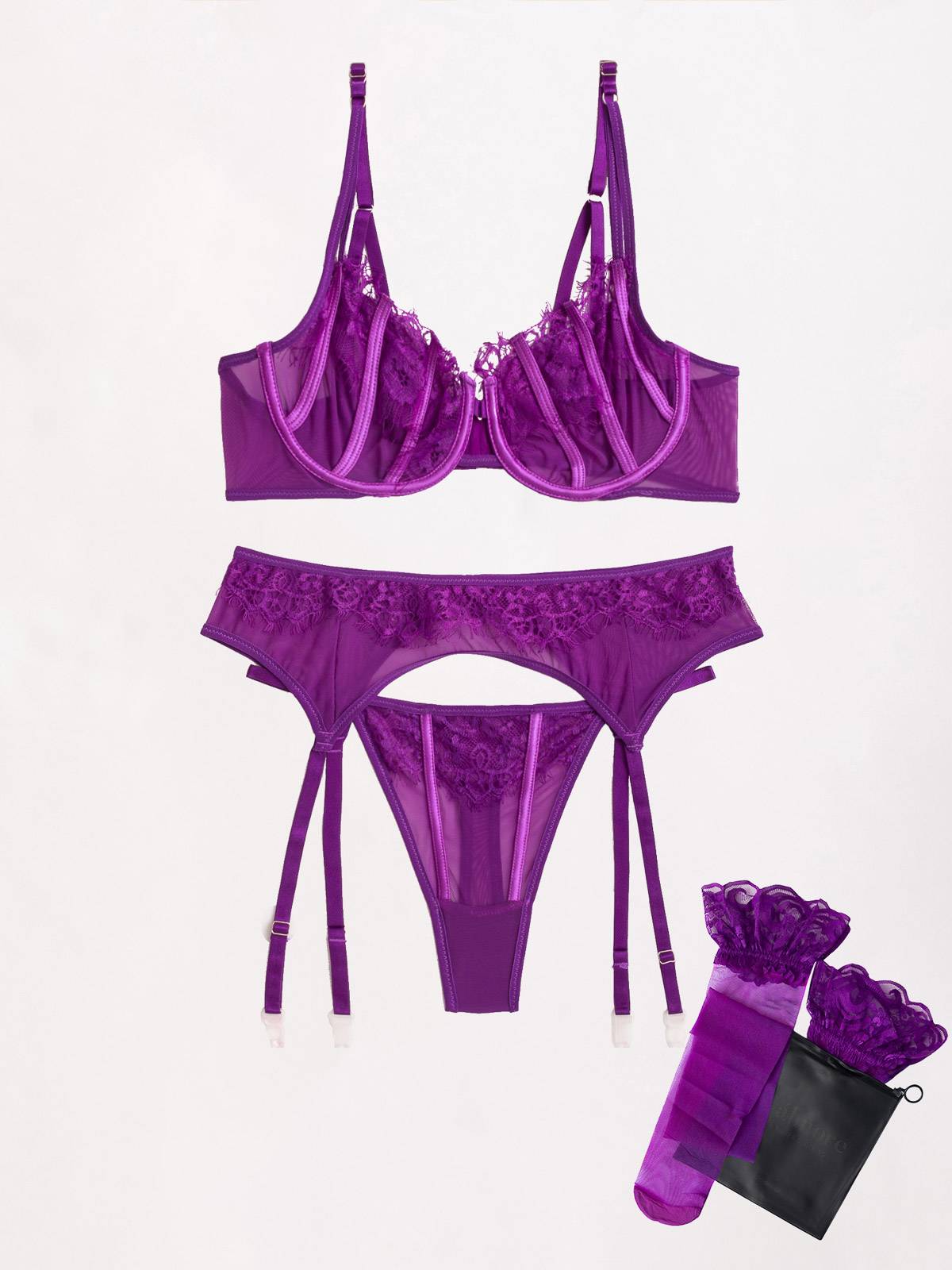 - Το σετ εσωρούχων αποτελείται από -4- τεμάχια: το σουτιέν, το string, τη ζαρτιέρα και τις ψηλές κάλτσες -μαζί- (4 pieces set)