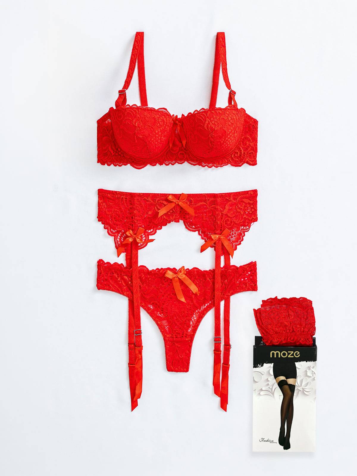 - Το δαντελωτό σετ εσωρούχων αποτελείται από -4- τεμάχια: το ενισχυμένο σουτιέν, το string, τις ζαρτιέρες και τις ψηλές κάλτσες -μαζί- (4 pieces set)