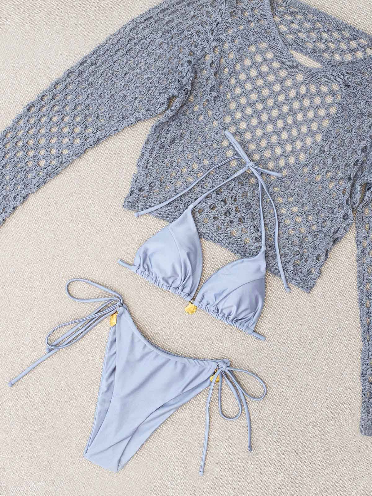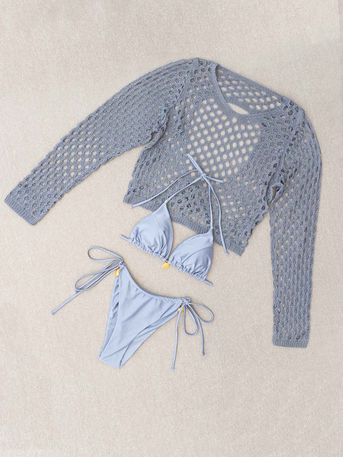 - Το σετ αποτελείται από 3 τεμάχια μαζί – το σετ μπικίνι, με το ενισχυμένο τρίγωνο, το δετό ψηλόμεσο brazil και το πλεκτό crop top (3 pieces set)