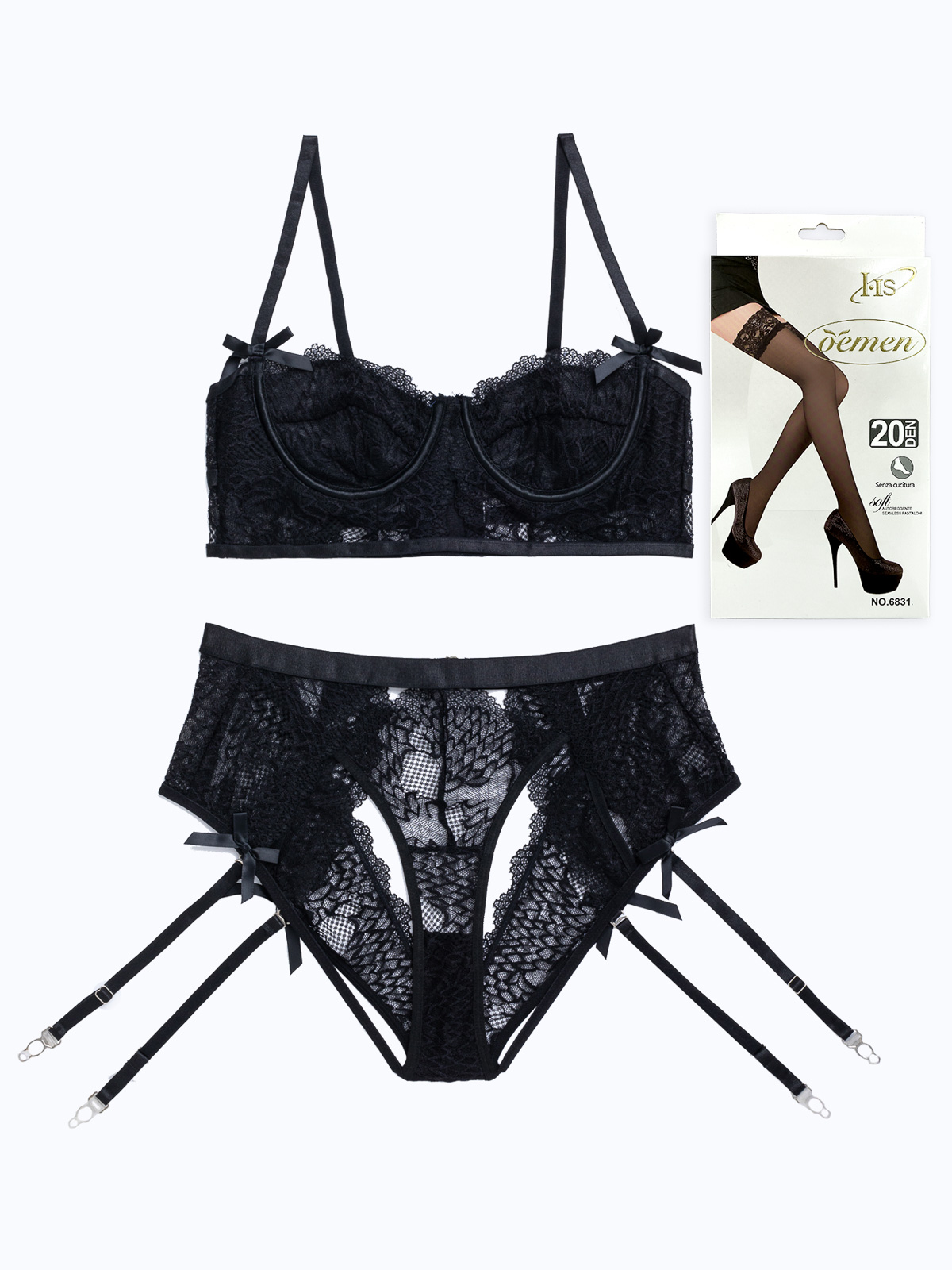 - Το σετ εσωρούχων αποτελείται από -4- τεμάχια: το μπουστάκι, το ψηλόμεσο brazil με τις 4 αποσπώμενες ζαρτιέρες και τις ψηλές κάλτσες -μαζί- (4 pieces set)