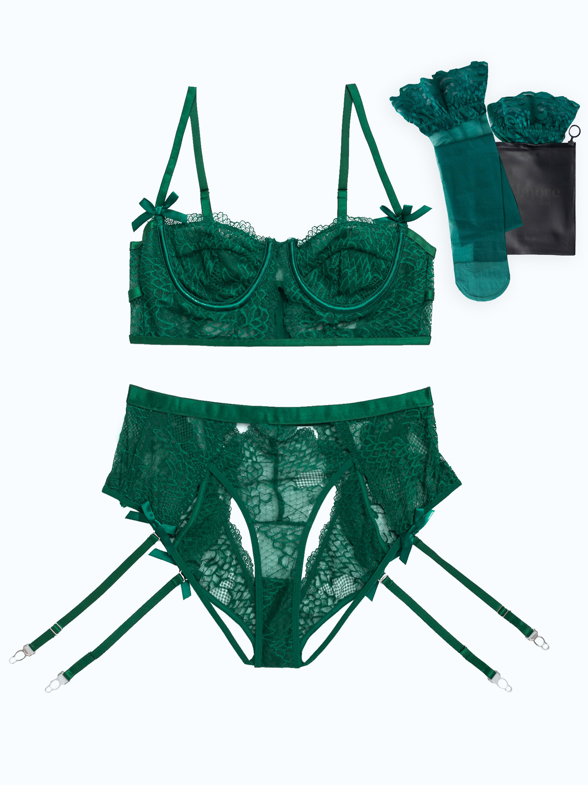 - Το σετ εσωρούχων αποτελείται από -4- τεμάχια: το μπουστάκι, το ψηλόμεσο brazil με τις 4 αποσπώμενες ζαρτιέρες και τις ψηλές κάλτσες -μαζί- (4 pieces set)