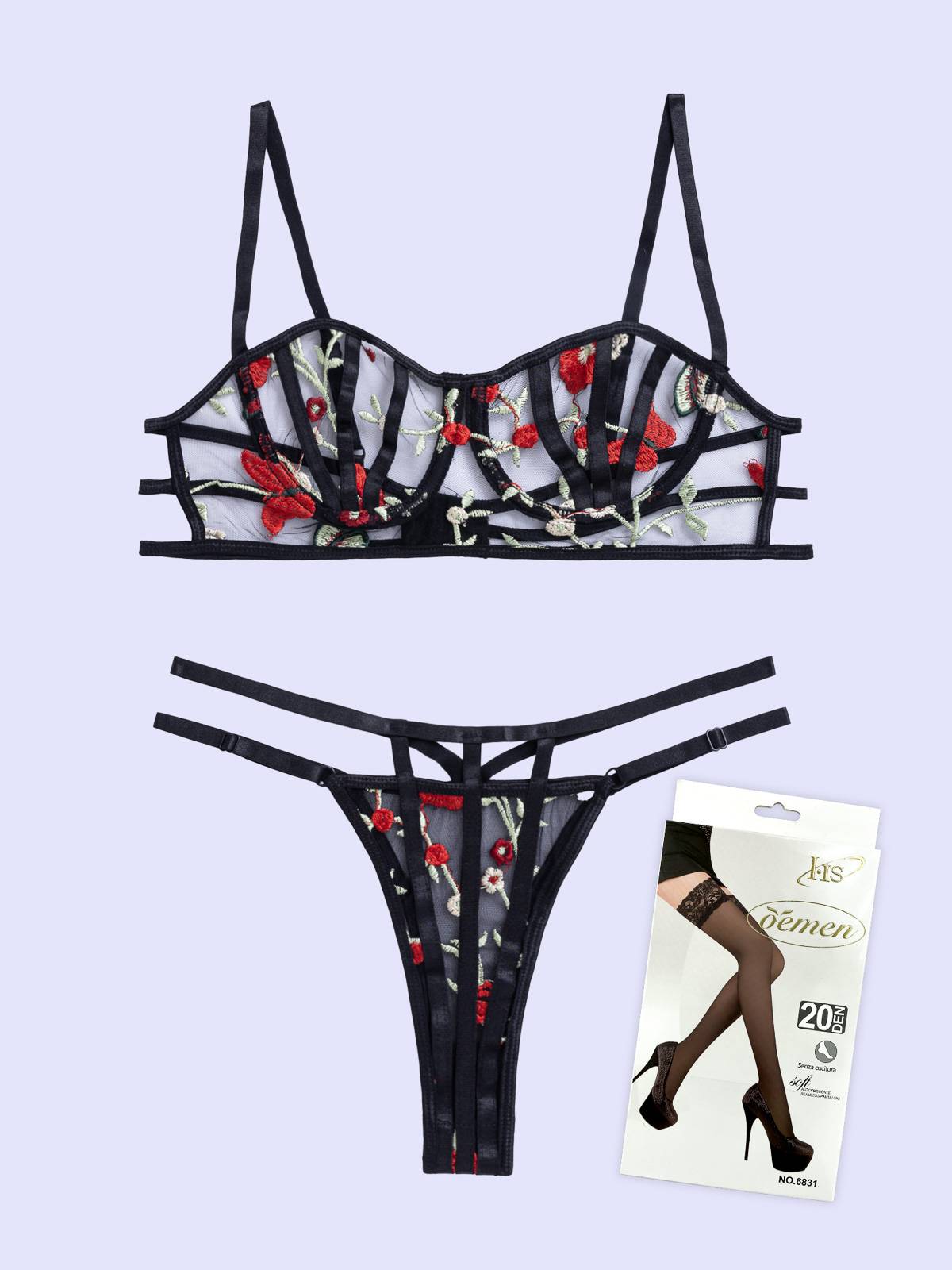 - Το σετ εσωρούχων αποτελείται από -3- τεμάχια: το σουτιέν, το brazil και τις ψηλές κάλτσες -μαζί- (3 pieces set)
