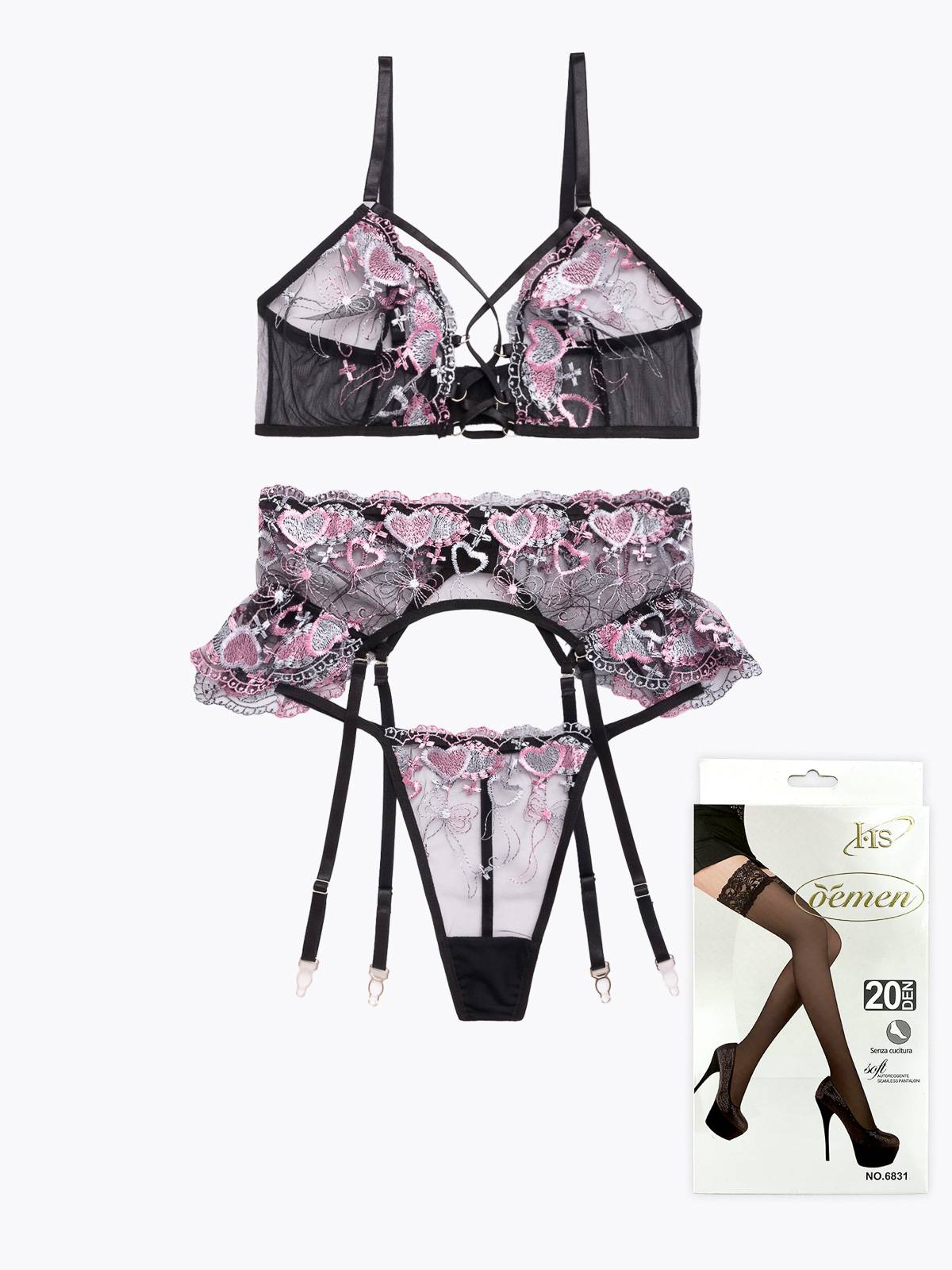 - Το σετ εσωρούχων περιλαμβάνει το bralette με το G-string εσώρουχο, τις ζαρτιέρες και τις ψηλές κάλτσες –μαζί– (4 pieces set)
