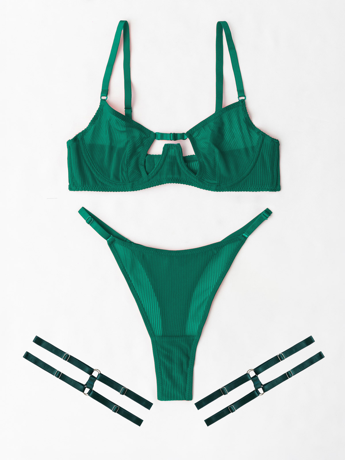 - Το σετ εσωρούχων αποτελείται από -3- τεμάχια, μαζί: το bralette, το string και δύο ρυθμιζόμενες καλτσοδέτες (3 pieces set)