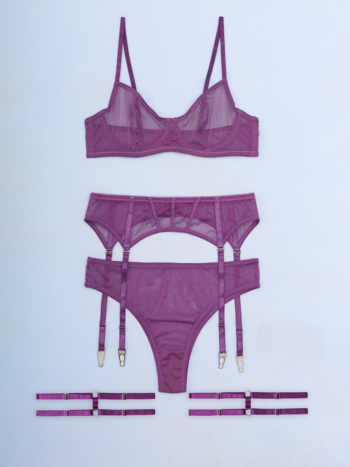 - Το σετ εσωρούχων αποτελείται από -4- τεμάχια: το σουτιέν, το brazil, τις ζαρτιέρες και δύο ρυθμιζόμενες καλτσοδέτες -μαζί- (4 pieces set)