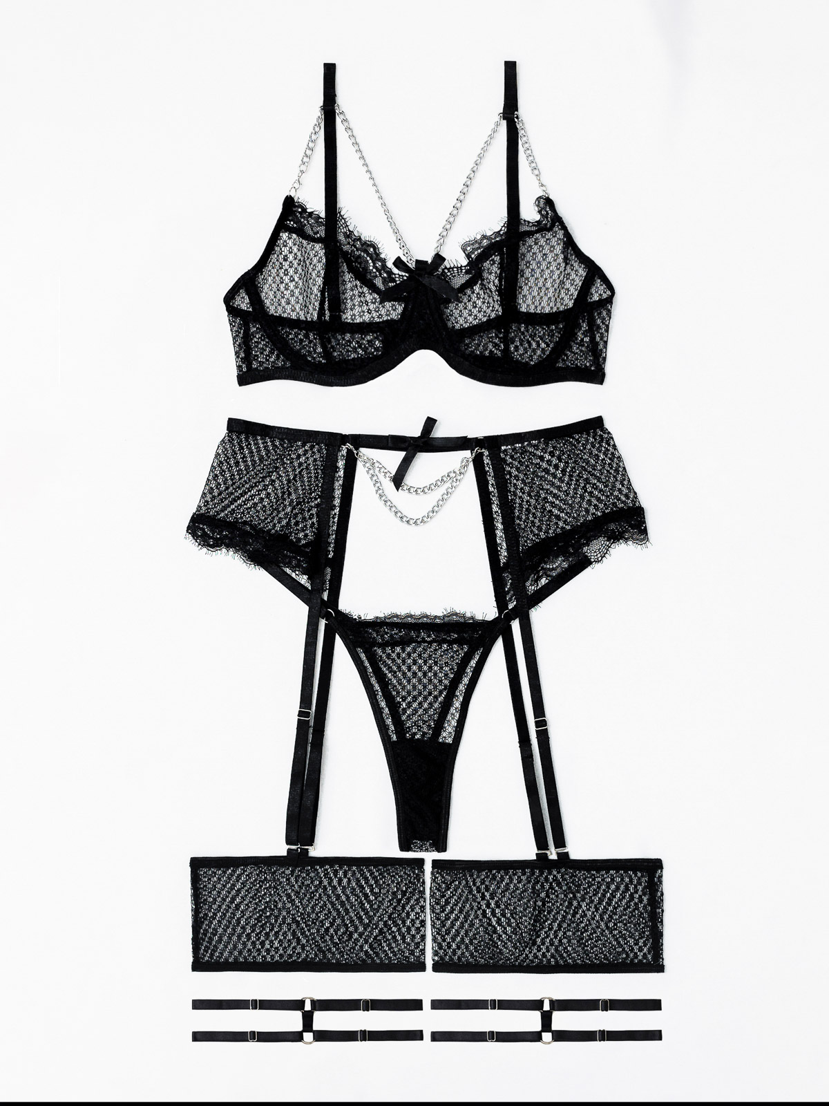 - Το σετ εσωρούχων αποτελείται από -5- τεμάχια: το σουτιέν, το string, τη ζαρτιέρα, δύο ρυθμιζόμενες καλτσοδέτες και επιπλέον, δύο διάτρητες καλτσοδέτες ΔΩΡΟ -μαζί- (5 pieces set)