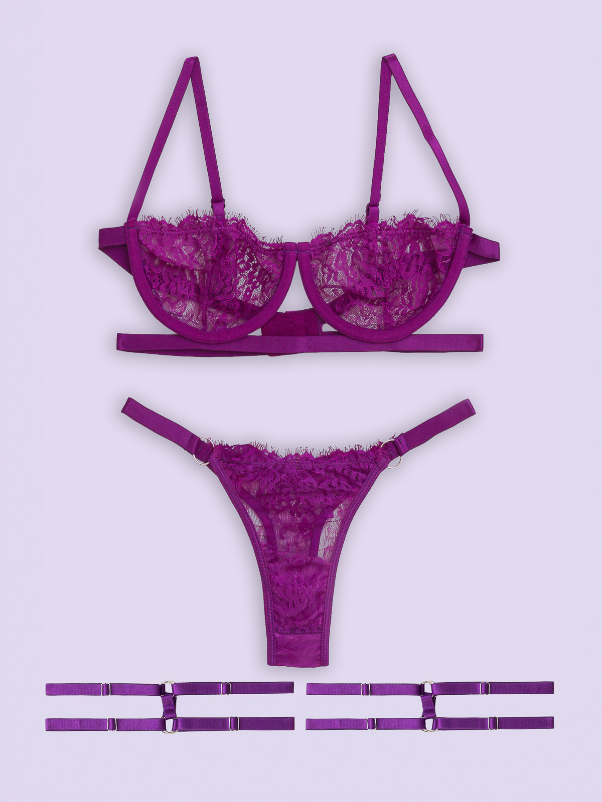 - Το σετ εσωρούχων αποτελείται από -3- τεμάχια: το σουτιέν, το string και δύο ρυθμιζόμενες καλτσοδέτες -μαζί- (3 pieces set)