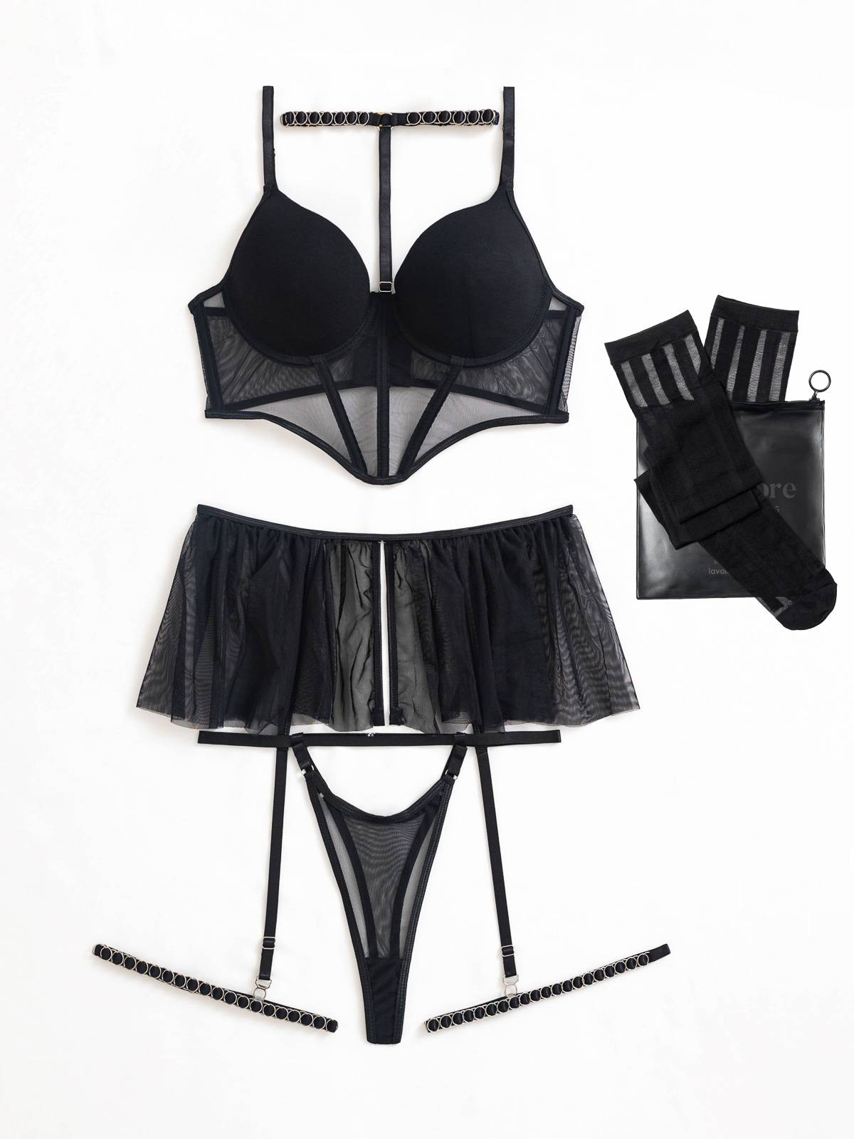 - Το σετ εσωρούχων αποτελείται από 4 τεμάχια: το μπούστο με το choker, το ψηλόμεσο string και τη ζαρτιέρα με τις καλτσοδέτες και τις ψηλές κάλτσες -μαζί- (4 pieces set)