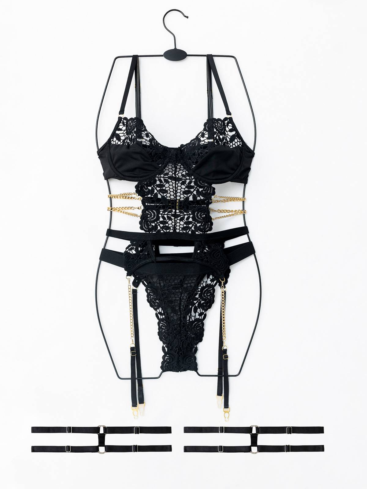 - Το σετ εσωρούχων αποτελείται από -3- τεμάχια: την μπουστοζαρτιέρα, το string και δύο ρυθμιζόμενες καλτσοδέτες -μαζί- (3 pieces set)