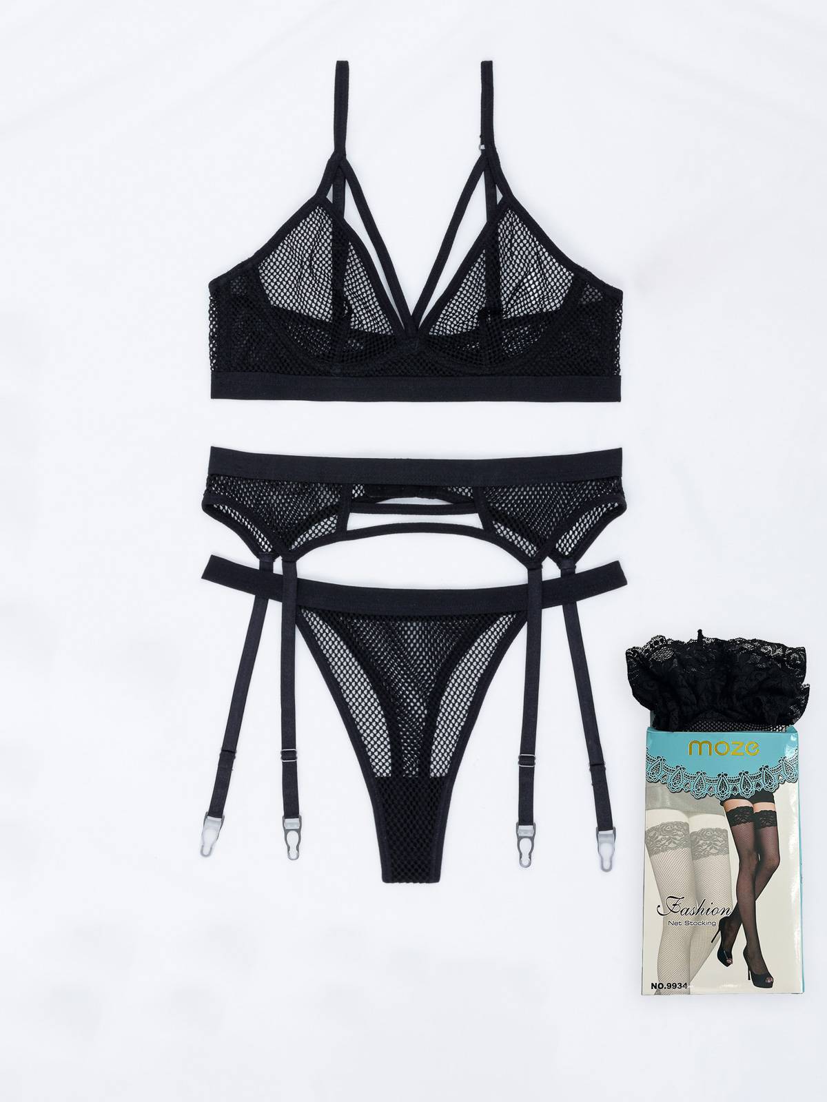 Σετ Σουτιέν Δίχτυ με Ψηλόμεσο String, Ζαρτιέρα και Κάλτσες