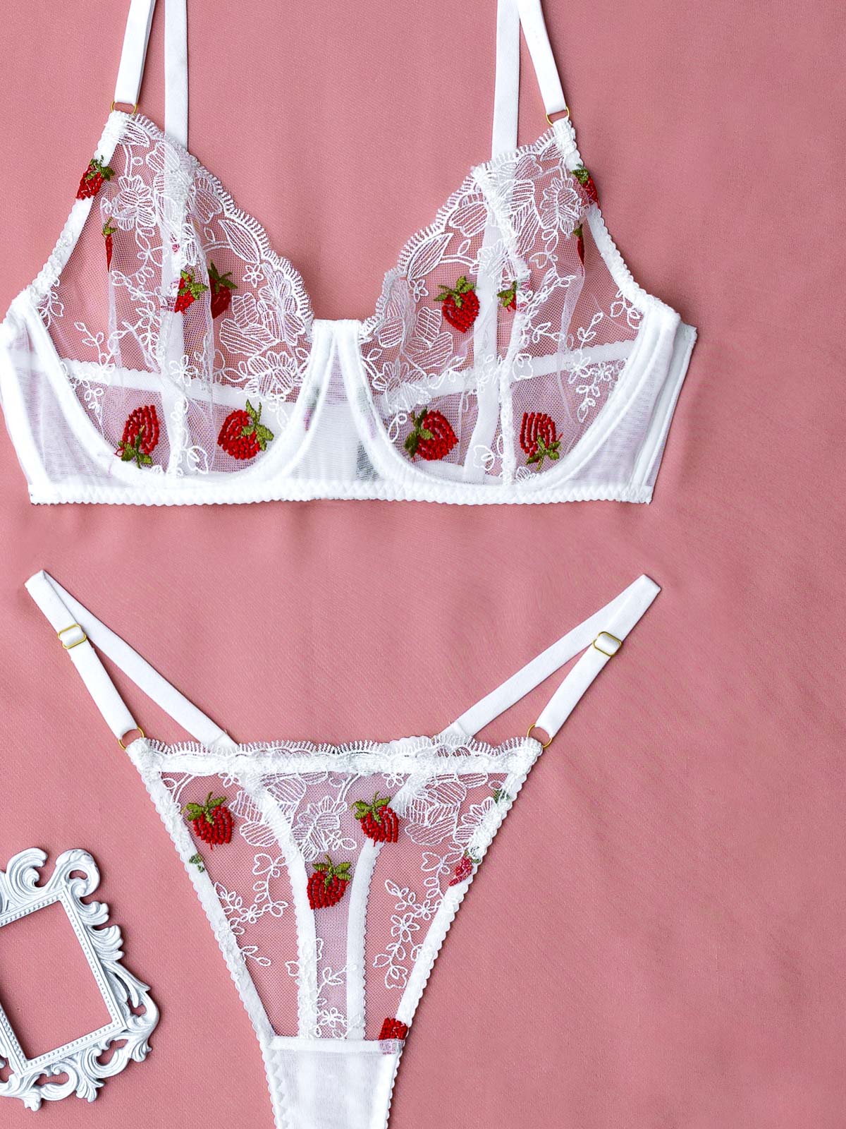 - Σετ εσωρούχων με κεντημένη διαφάνεια με συνδυασμό λουλουδιών και κόκκινες φράουλες