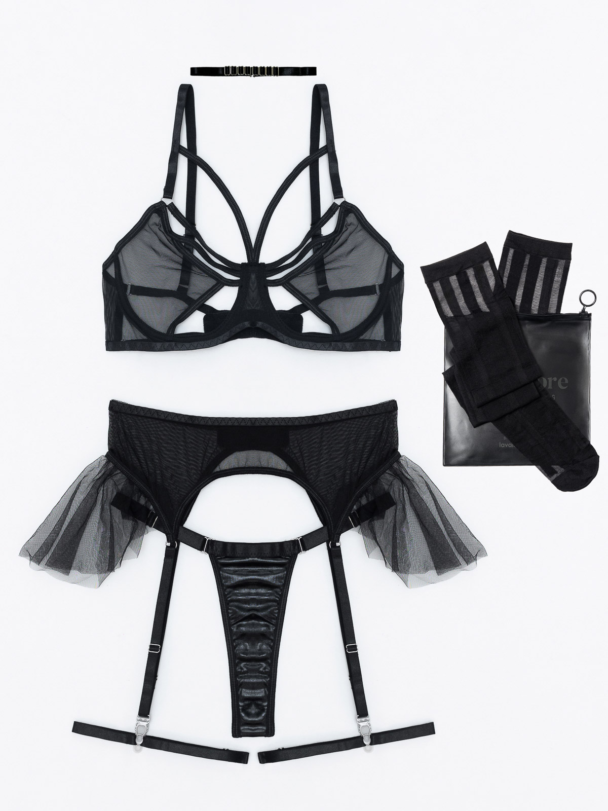 - Αισθησιακό σετ εσωρούχων αποτελείται από 6 pieces -μαζί- το σουτιέν διαφάνεια, το ψηλόμεσο String από δερματίνη, το choker, τα γάντια, τη ζαρτιέρα, τις καλτσοδέτες και τις ψηλές κάλτσες (6 pieces set)